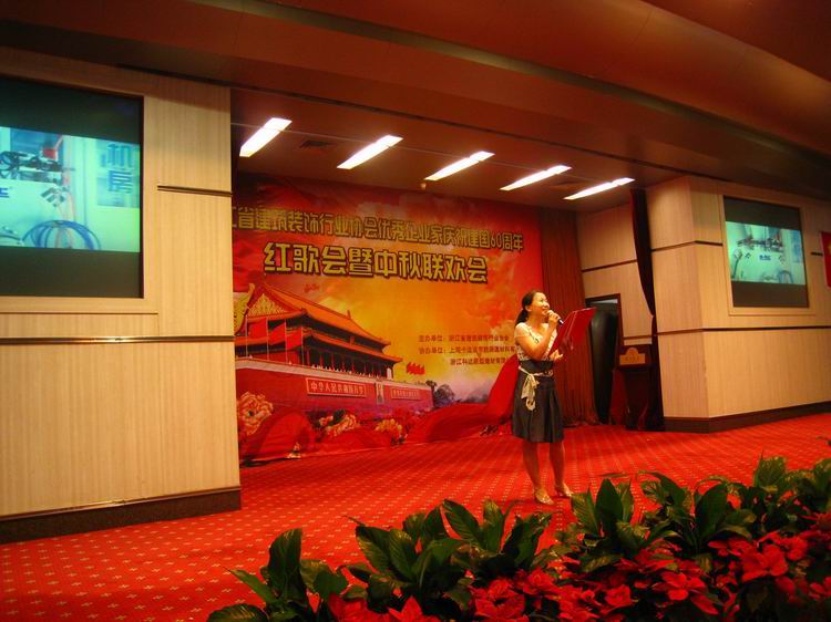 9月25日下午,公司參加了省家裝協會舉辦的慶祝建國60周年紅歌會暨中秋聯歡會,櫥柜部陸美勤進行聲情并茂的詩朗誦《問候您,祖國》。博得臺下的與會人員的陣陣掌聲。此外也在眾多的歌舞節目中脫穎而出獲得優勝獎。