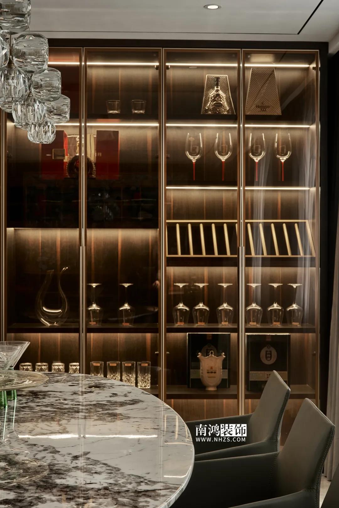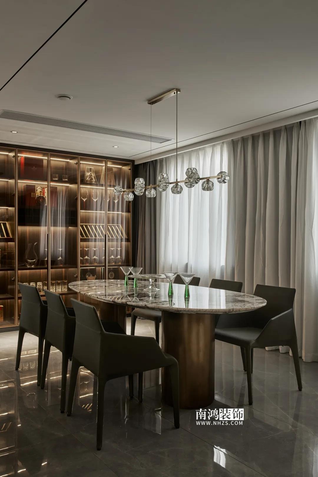 【項目·信息】 地址 / 華瑞晴廬 戶型 / 三室兩廳 面積 / 200㎡ 風格 / 現代極簡 設計施工 / 浙江南鴻裝飾 01. 客戶需求 本案的男業主是位個體戶老板,事業有成,性格熱情開朗,十分好客,由于夫妻二人目前沒有小孩,父母也是偶爾來住,對房間的需求并不大,因此戶型從原來的5房3衛改為了3房2衛,并盡可能擴大客餐廚的面積,來滿足業主的會客需求。 02. 裝飾亮點 “人內在的細膩與深切的情感,需要與之對等的空間來承載。灰與黑,看似簡單平靜,卻蘊含著無窮的魅力。” 屋主偏愛深色系,因此設計師精細地調配深色在空間中的比例,運用護墻板、大理石、皮革等質感材質,借助燈光效果,為他們打造了這個頗具神秘感和高級感的暗色空間。 03. 戶型分析 & Design Drawing 1、進門靠墻增加一組鞋柜以提升玄關收納。 2、原戶型中的兩個房間合并成餐廳區域,并與客廳打通,使人一進屋便能感受到公空間的開敞氣勢。 3、原有的一個衛生間改造成衣帽間,將主臥打造成一個包含休閑區區、寬敞主衛、衣帽間在內的豪華套間。 04. 設計落地 很多人酷愛深色 與其說天性愛低調 不如說是深色所散發出的靜謐氣質 恰好與渴求安寧的內心產生了共鳴 灰與黑打造的客廳 洋溢著高級感與神秘氣質 豐富的紋理、材質變化 在空間內形成一種微妙的和諧 熱情張揚的紅 與深沉神秘的黑 兩相對立的色彩語言 帶來十足的視覺沖擊力 & Dining Hall 黑色的皮革餐椅 搭配高顏值的大理石餐桌 打造精致的多人用餐環境 餐廳做整面酒柜 置入暖黃燈帶 既是酒水的完美收納 又是一處身份品味的象征 玄關往客廳的過渡區域 安置精心打造的吧臺 成為過道口的一處個性風景 也是日常的簡餐區 廚房擁有標準的U形操作臺 儲物充足,動線流暢 深色櫥柜與臺面 完美塑造一體式空間感 主臥承襲整體的暗色風格 深沉的灰黑色打底 傳達平和寧靜的空間情緒 豪華的主臥套房 包含休閑區、主衛與衣帽間 擯棄了所有多余的裝飾 只保留每一件必需的家具 獨立衣帽間設計 黑色柜體內藏有燈帶 酷雅有型 純粹的黑構建理性的質感 透過白色紗簾進入室內的日光 讓客臥空間 簡潔中帶上了變化 次臥床尾 安排書桌椅與書架 灰色的墻布 排除一切冗余 力求沉穩大氣 經過戶型調整 主衛內部更顯寬敞 浴缸與淋浴區分居兩側 功能區的豐滿 是給生活最大的舒適 次衛風格與主衛相似 石紋瓷磚搭配木質臺盆柜 淋浴區內設置壁龕 視覺舒適,實用性強