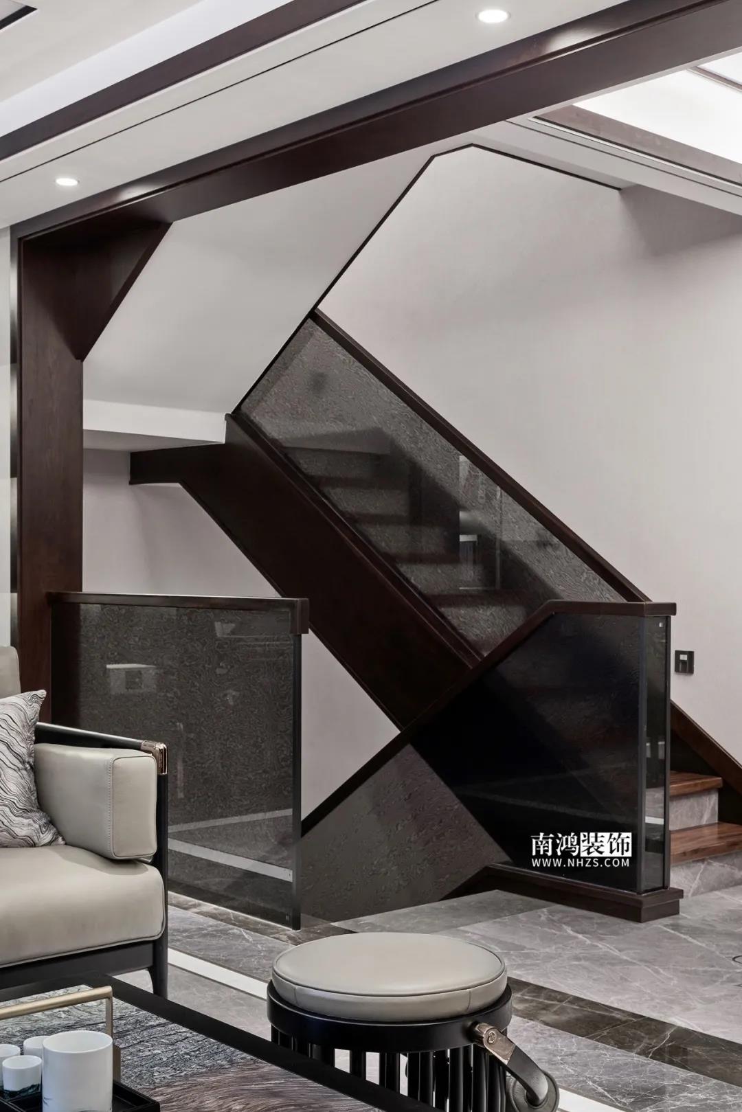 A family of three, the life of two generations. In this neat space, there is no complicated shape, the straight-line design gives more room for expression of Chinese art, nurturing a distinctive elegance, and allowing people to appreciate the essence of oriental aesthetics in the relaxation. 01. 東方古韻 ORIENTAL RHYME 深色的木飾面彰顯穩重與大氣 多層次的燈光、材質烘托氣韻 中式的素雅色彩 搭配現代感的利落線條 清晰而明亮的結構 帶來恒久的美感 02. 客廳 LIVING ROOM 細致排布的空間格局中 色彩與形體總能讓我們產生第一直覺 厚重的深木色中和上清淺的灰白 讓空間帶上了歲月沉淀的藝術感 吊頂做工細節到位 現場折邊,木線內嵌 勾勒出大氣高級的調性 沙發后的柜體融合琴區 鋼琴鍵上,指尖躍動 記錄著生活的美好 落地窗映照著庭院風景 忙碌的快節奏生活 總需要一塊靈魂的歇腳地 供人放下疲憊,掃清愁緒 03. 餐廚空間 KITCHEN | DININGROOM 經由樓梯廳過渡至餐廳區域 家具以質樸素凈的自然肌理 營造低調而莊重的空間磁場 器物靜置于空間內 意境便在其中 安靜渲染著素樸的美學 半開放式廚房 與餐廳保留了互動感 左側做到頂黑色柜體 完美解決廚區收納 同時將部分電器內嵌 看起來簡潔清爽 04. 樓梯間 STAIRCASE 樓梯踏步由木材與石材結合 肌理感的互動豐富了空間層次 負一層的樓梯設計 更有立體幾何美感 成功制造出視覺的虛實變化 05. 臥室 BEDROOM 溫馨典雅的主臥空間 圓潤的弧度流露出溫柔氣質 一切從生活的本質出發 給予居者心靈的放松 衣帽間處于睡眠區與主衛之間 將兩個空間彼此聯通 衣柜門順勢做了房門 充分體現設計的巧思 客臥選取芥末黃進行點綴 頗具藝術感的烏云壁紙 讓時尚優雅的氣息緩緩彌漫 06. 書房 STUDY ROOM 方正的線條結構 灰色的中性色調 設計在平靜而克制的基調中 力求喚醒居者內心的安寧 07. 功能區 LEISURE ROOM 瑜伽健身室 開放式設計與超大鏡面 不顯拘束的空間給予使用者最大的舒適 墨綠色打造的榻榻米房 滿足收納的同時 提供了一塊自在使用的空間 08. 衛生間 BATHROOM 墻地面通鋪淺色瓷磚 明亮的用色更顯寬敞